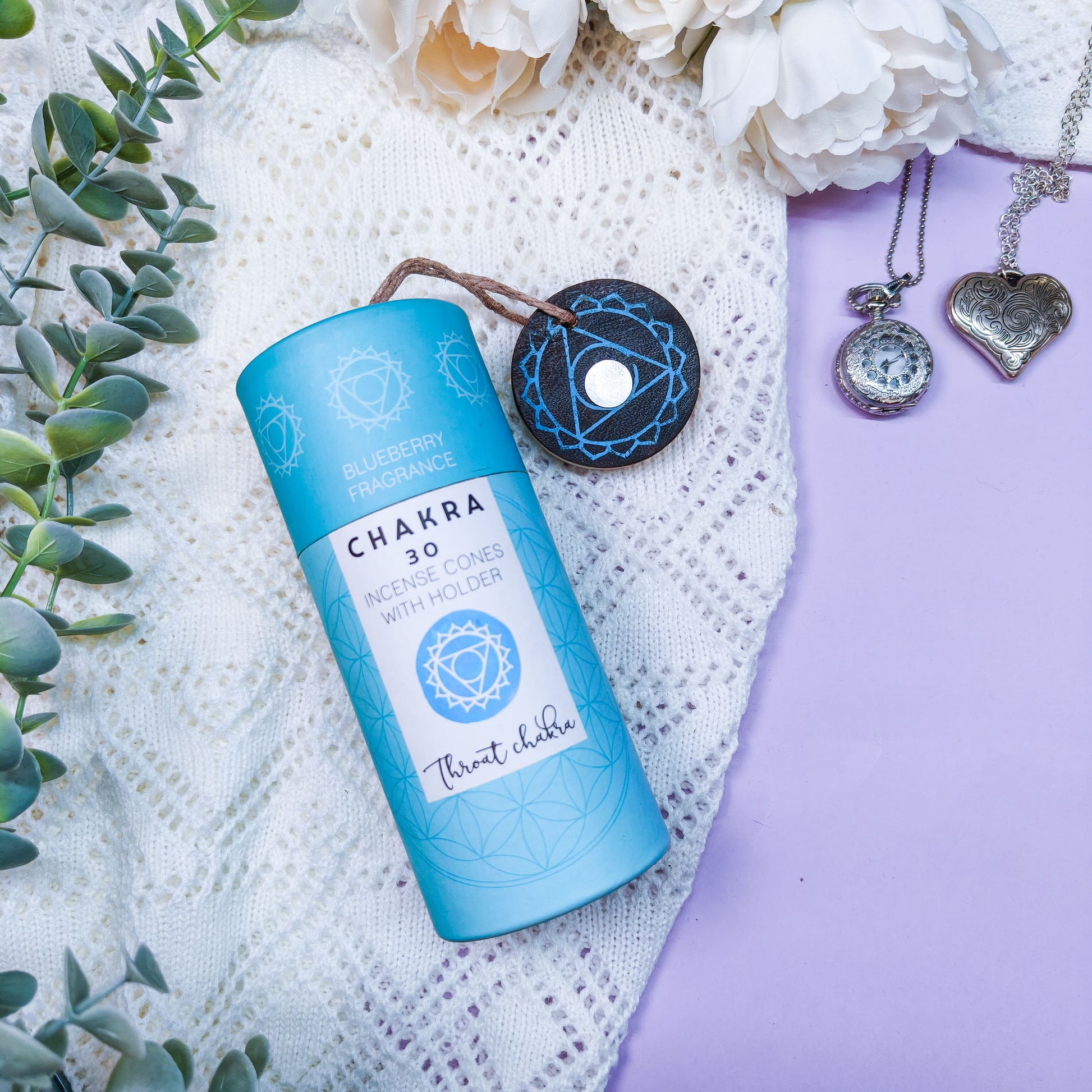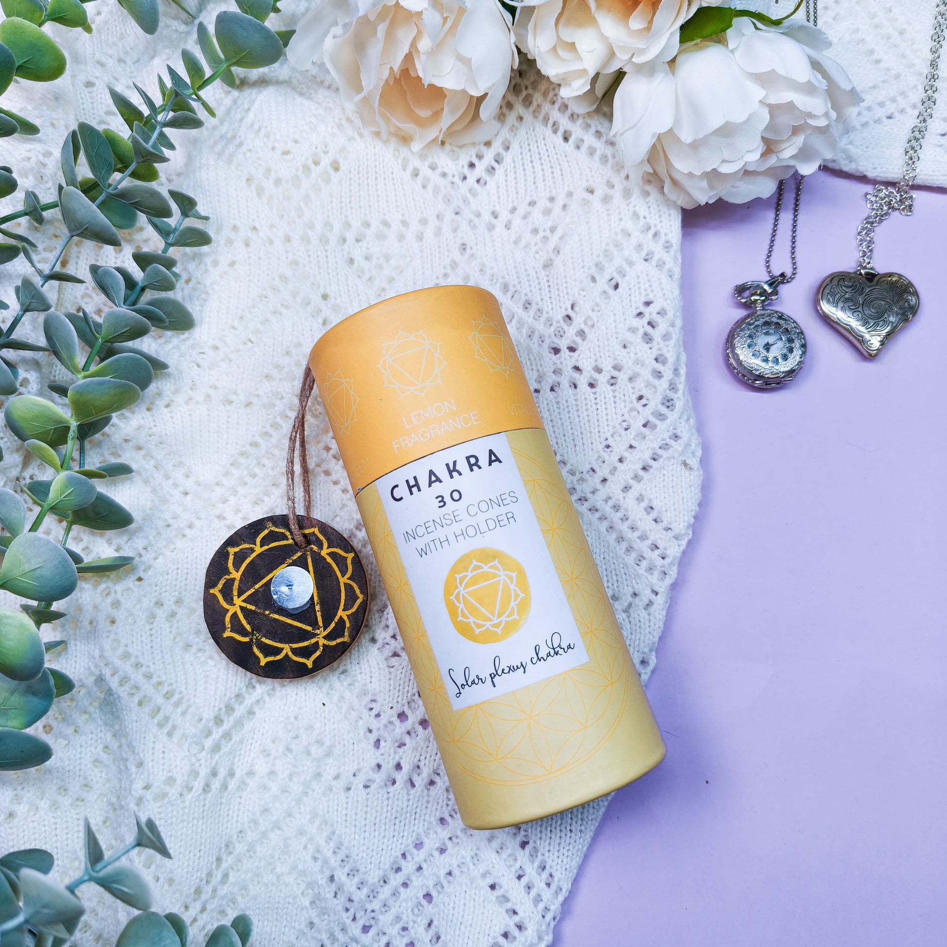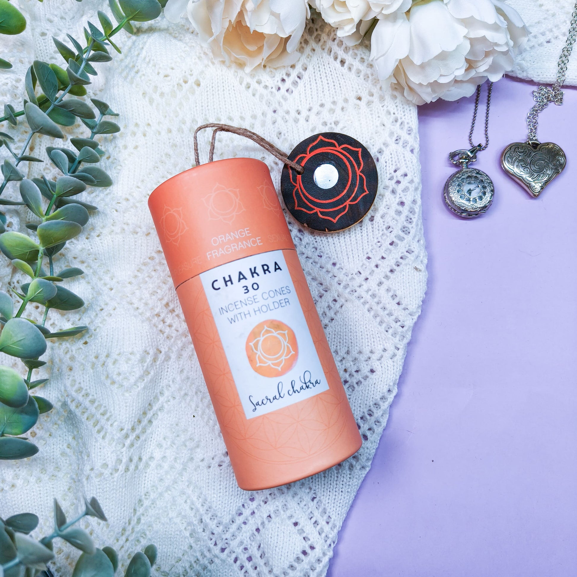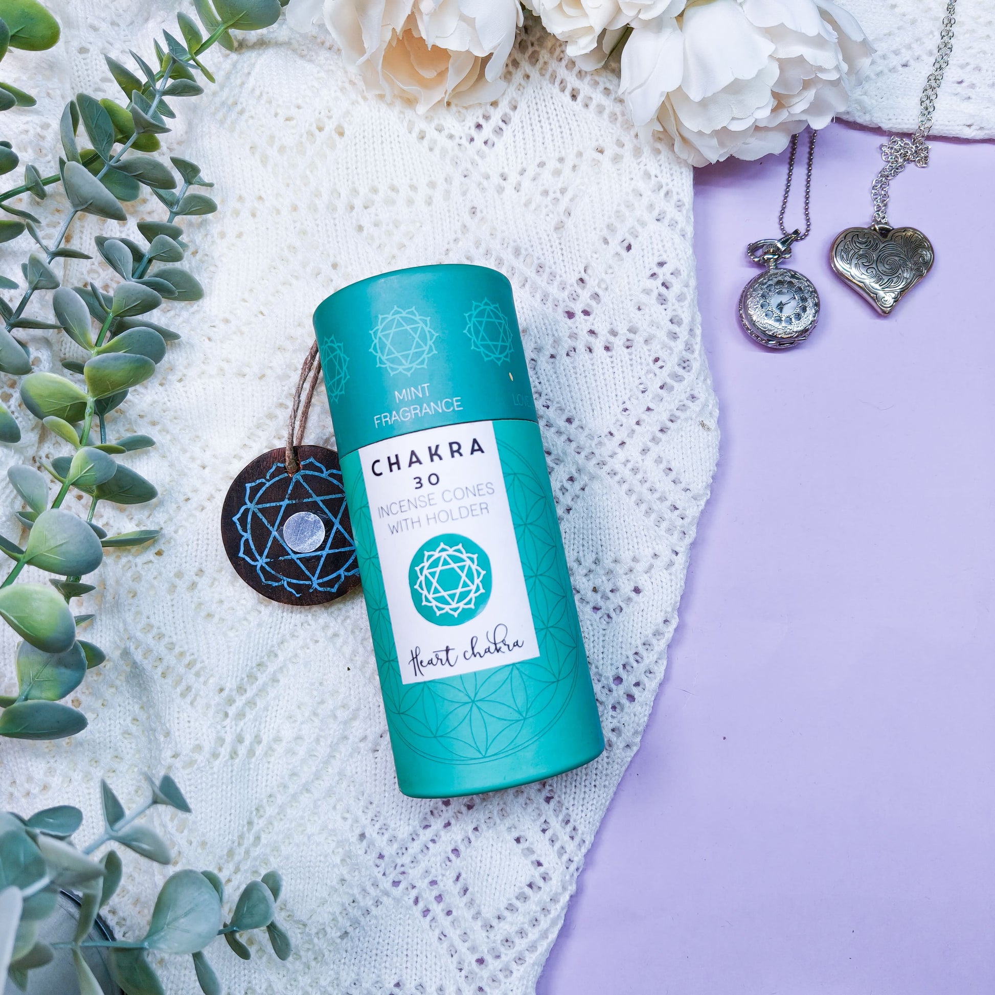 Suitsukkeet jokaiselle chakralle! Yksi pakkaus sisältää 30 suitsukekartiota sekä puisen suitsuketelineen.