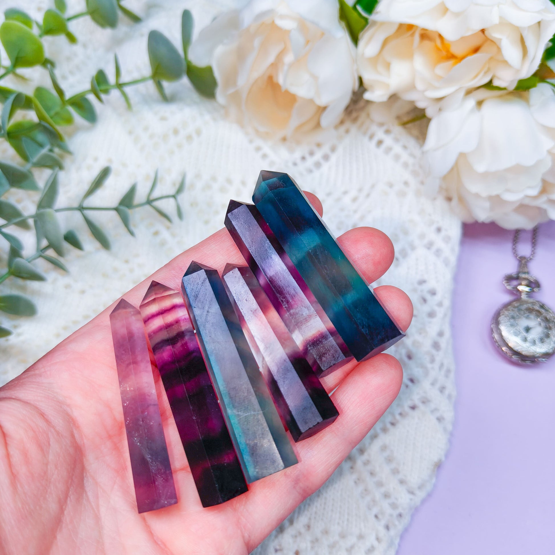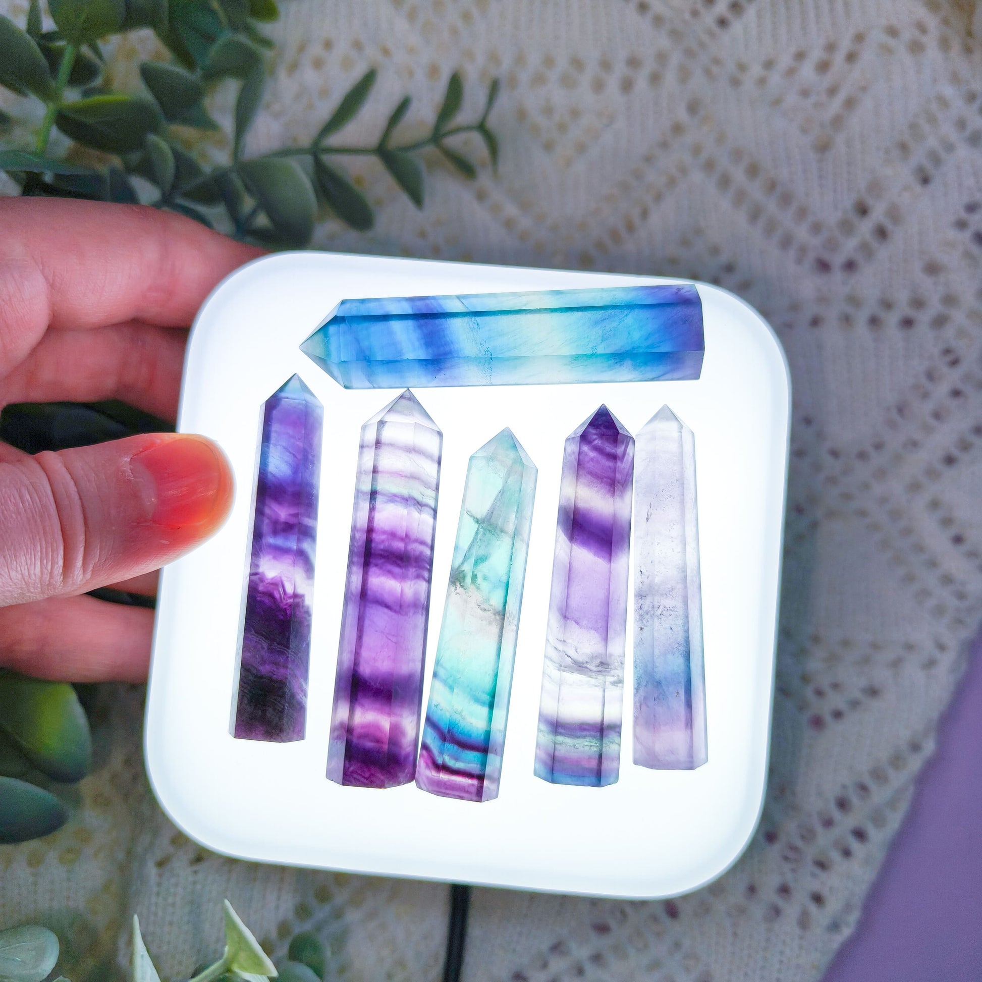 Avainsanat: fluoriitti, vihreä, lila, violetti, keltainen, oranssi, sininen, sateenkaari, kivikaiverrus, muotoon hiottu, kristalli, voimakivi, energiakivi