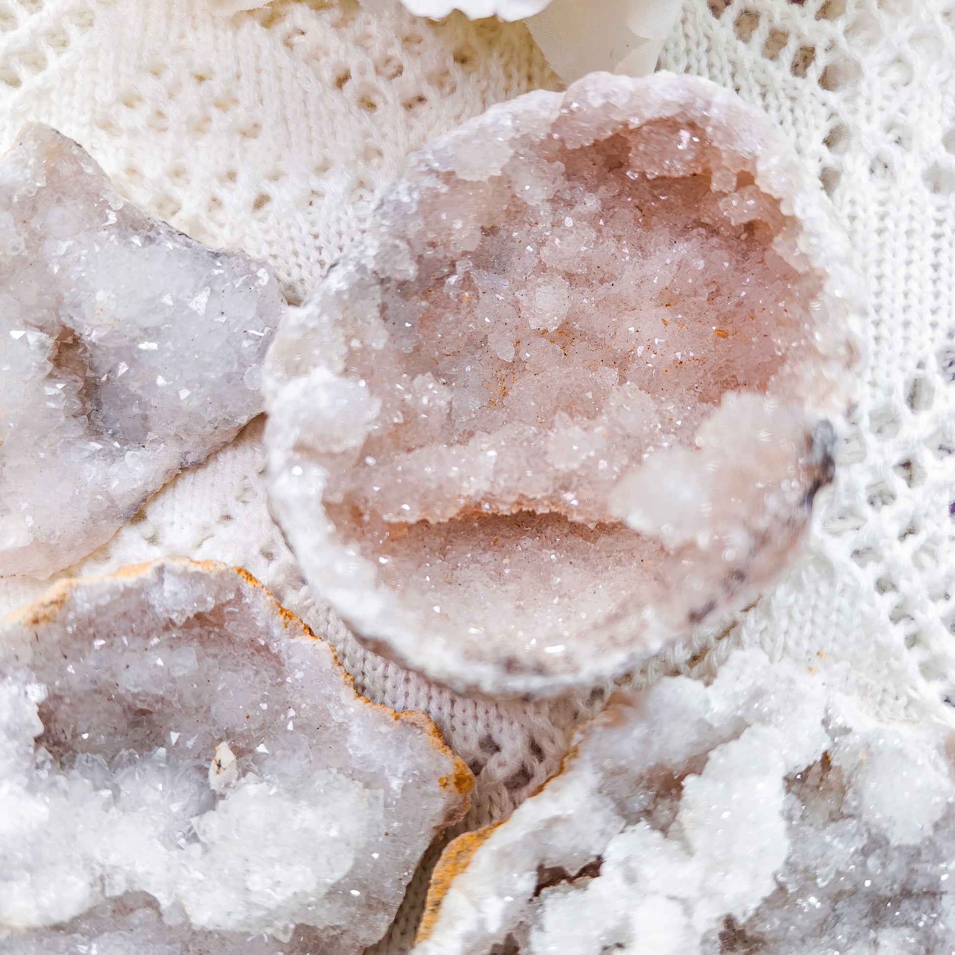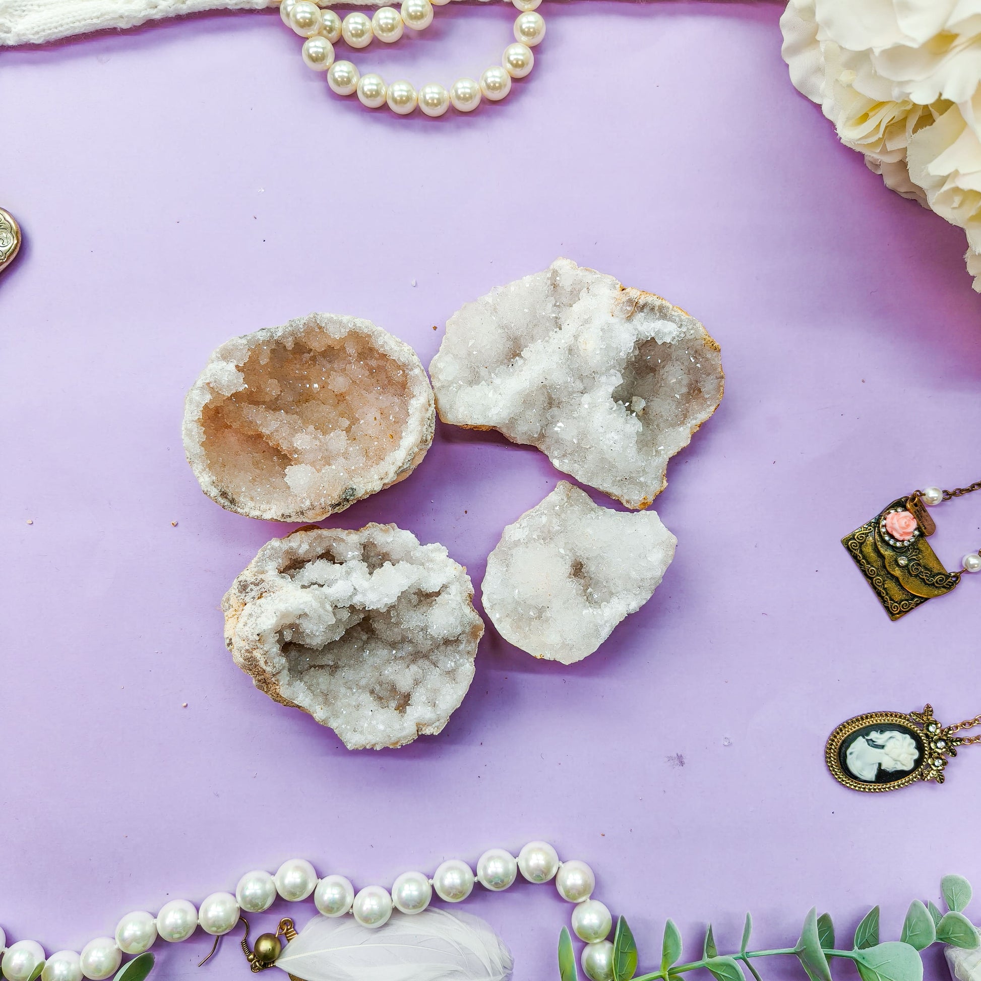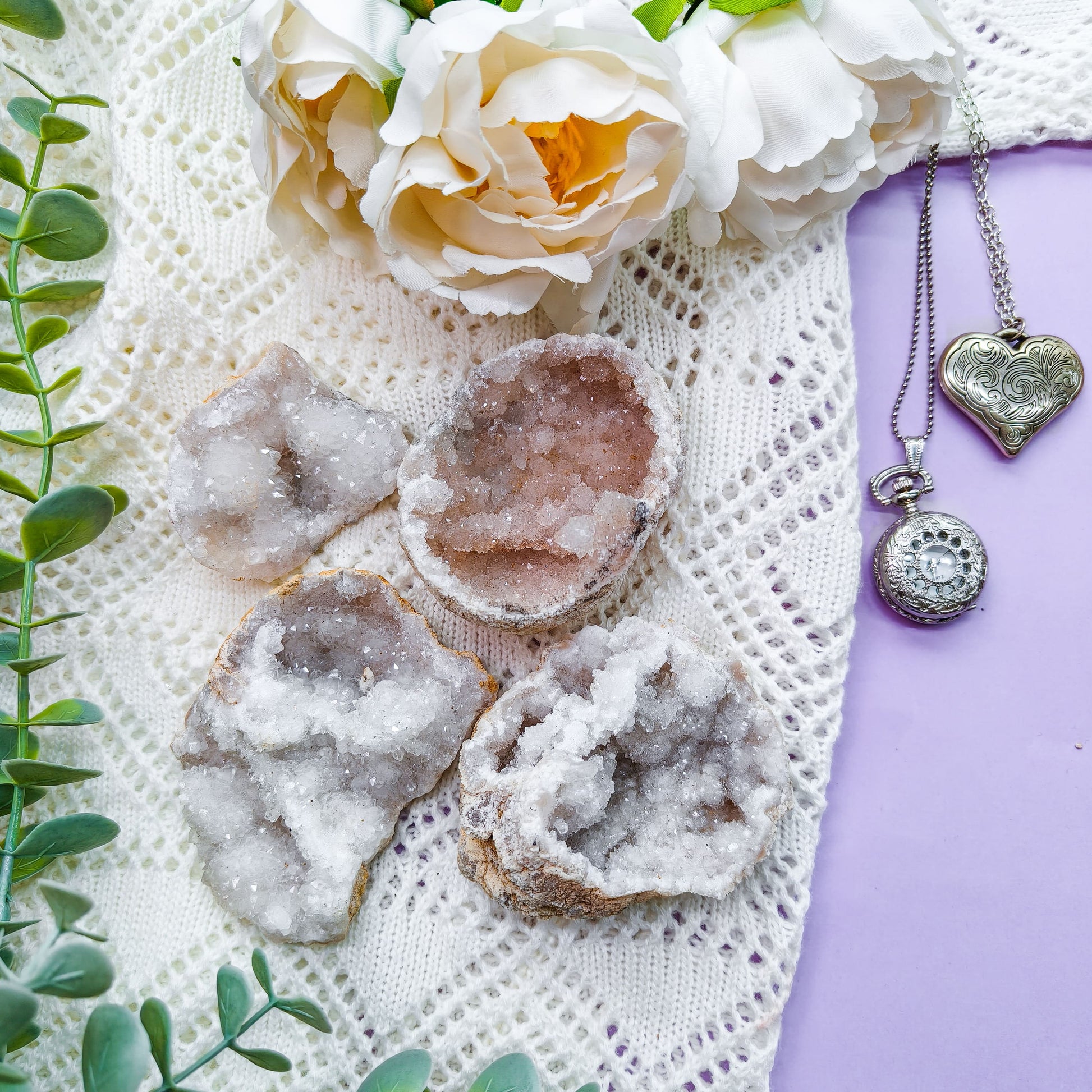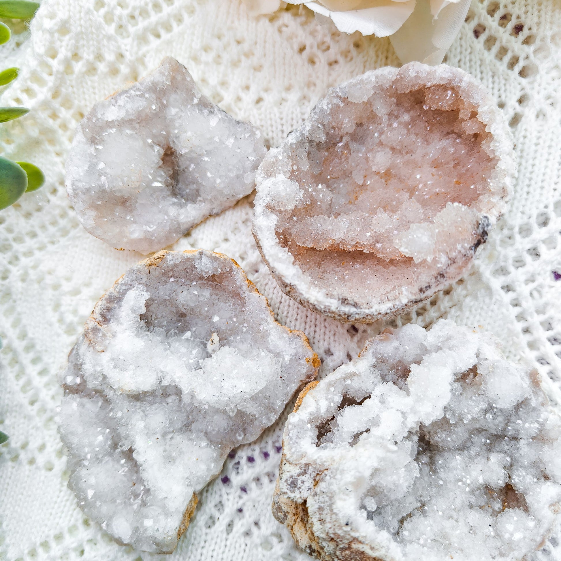 Jokainen geodi on oma uniikki yksilönsä ja niiden koko ja muoto vaihtelee. Ne hajoavat helposti, joten käsittele varoen.