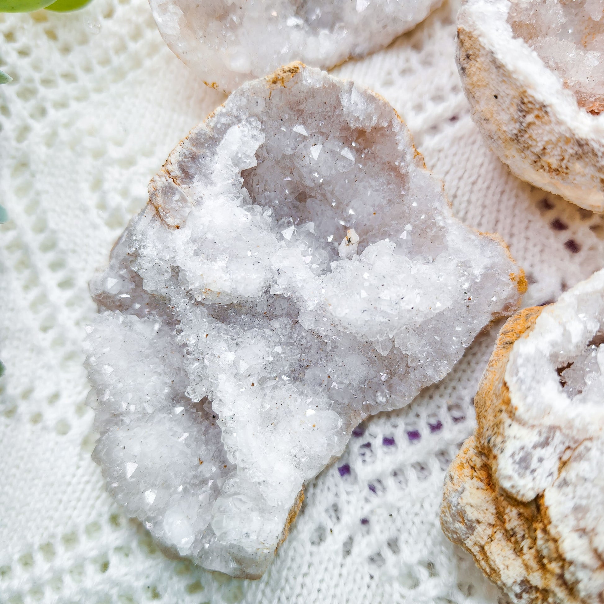 Avainsanat: kalsiitti, geodi, klusteri, valkoinen, läpinäkyvä, väritön, aloittelija, raaka, kristalli, voimakivi, energiakivi