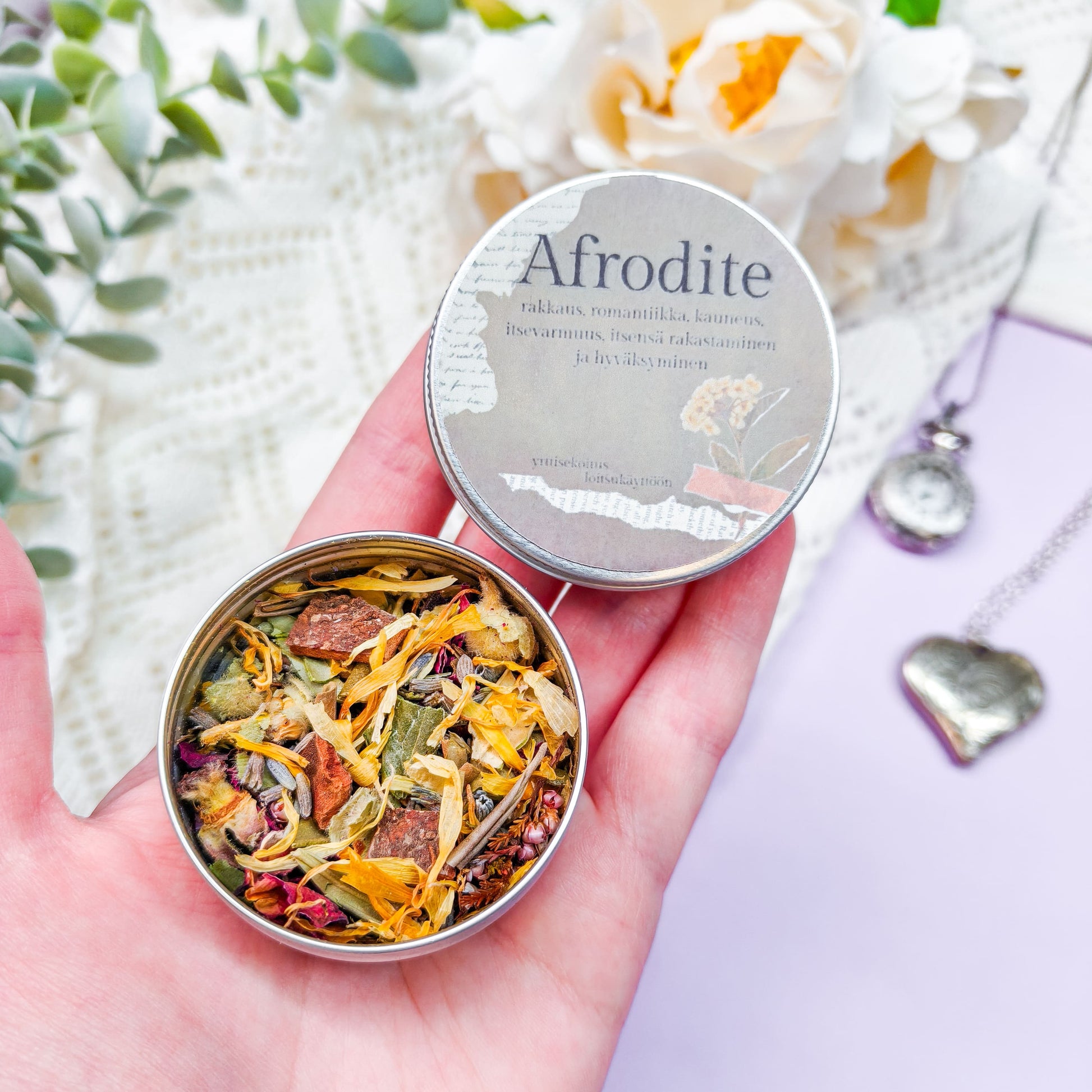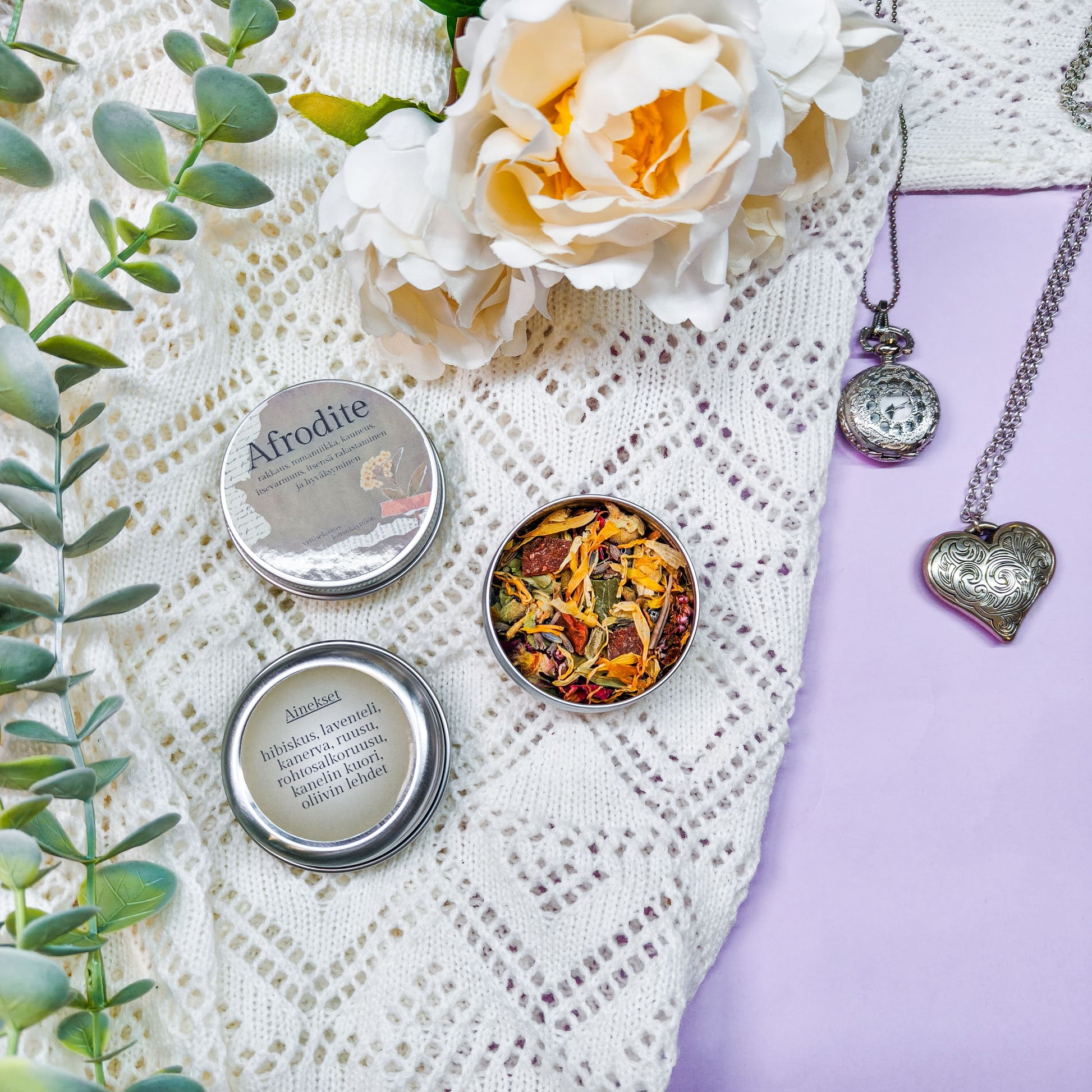 Ainekset: hibiskus, laventeli, kanerva, ruusu, rohtosalkoruusu, kanelin kuori, oliivipuun lehdet