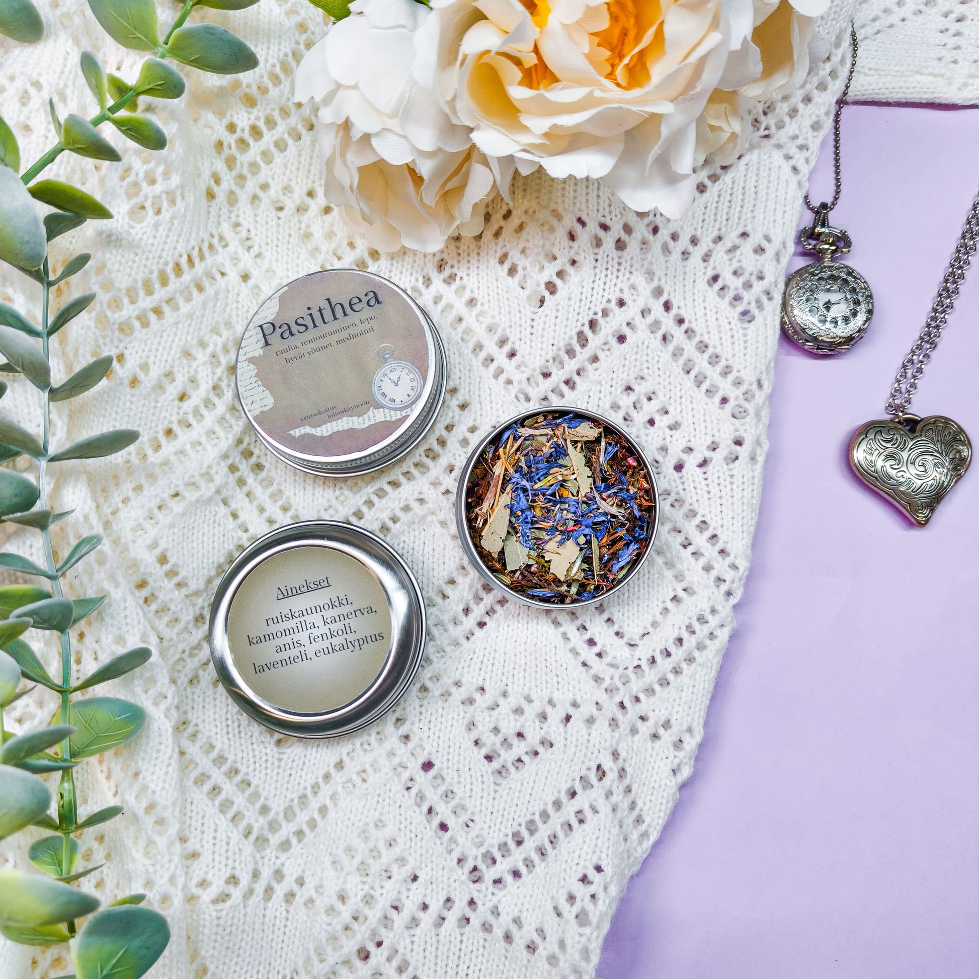 Ainekset: ruiskaunokki, kamomilla, kanerva, anis, fenkoli, laventeli, eukalyptus