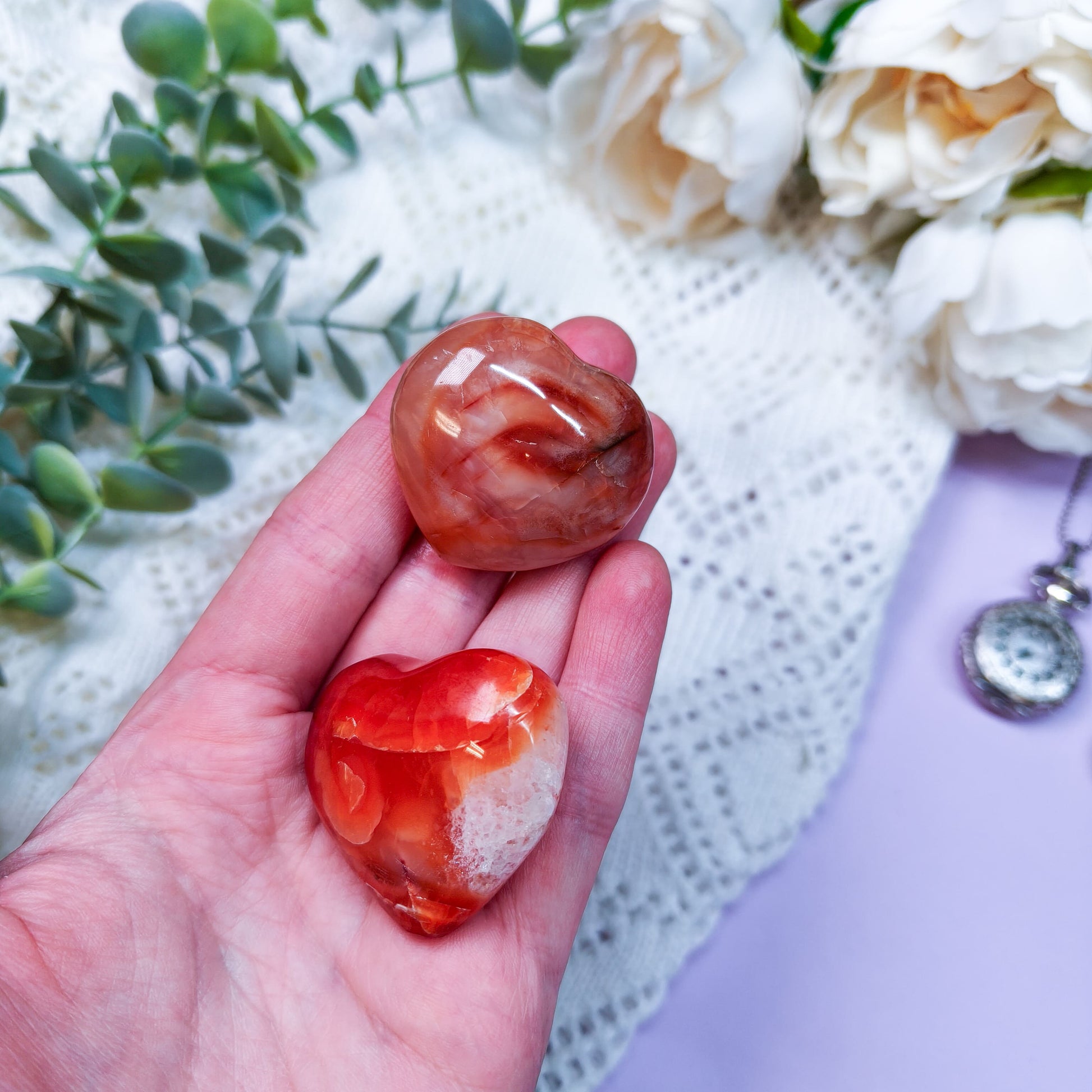 Avainsanat: karneoli, akaatti, oranssi, punainen, valkoinen, sydän, kivikaiverrus, muotoon hiottu, aloittelija, kristalli, voimakivi, energiakivi