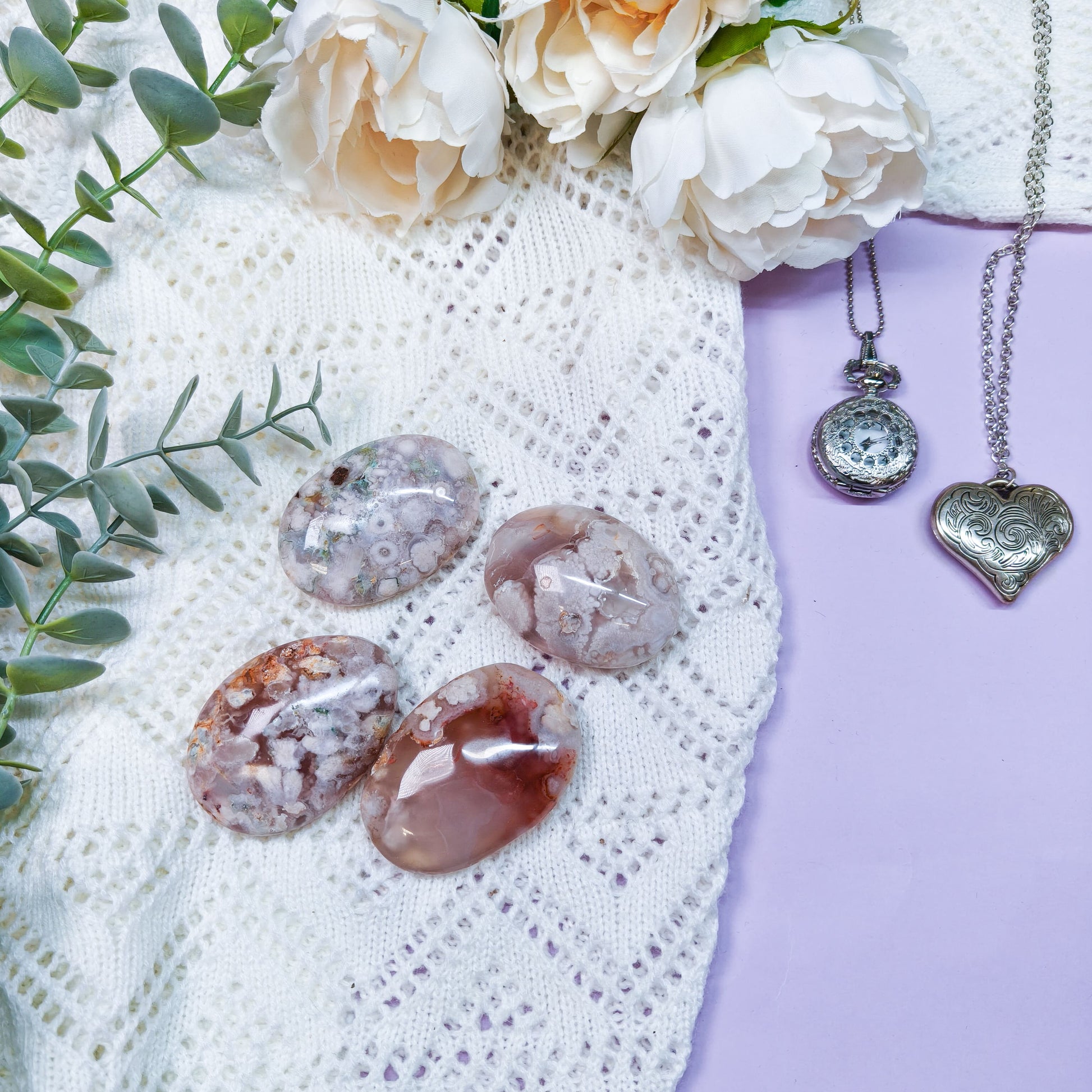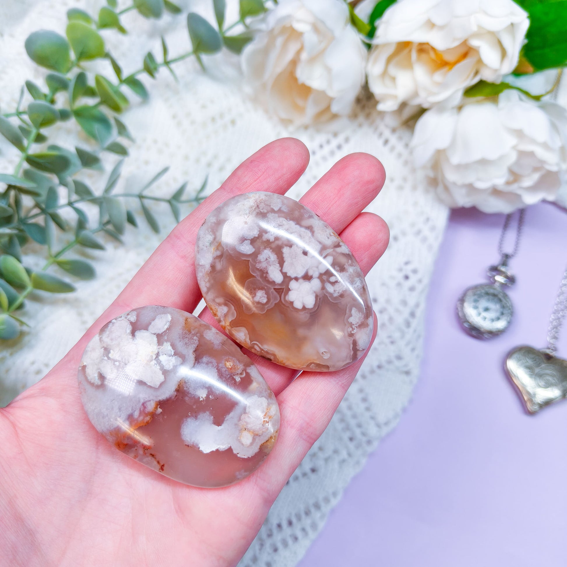 Avainsanat: kukka-akaatti, akaatti, vaaleanpunainen, beige, punainen, pinkki, kukka, kuvio, keräily, harvinaisuus, kivikaiverrus, muotoon hiottu, kristalli, voimakivi, energiakivi