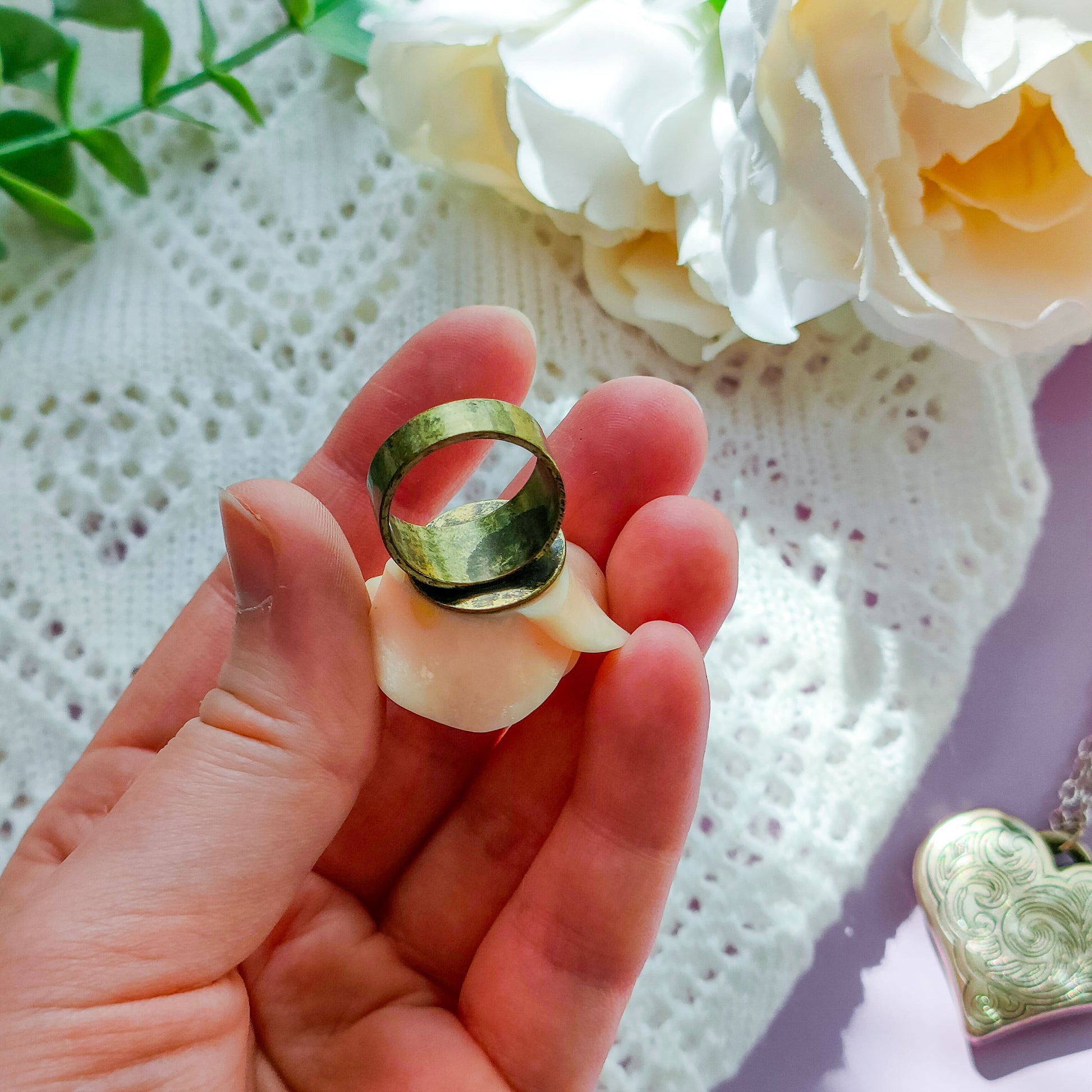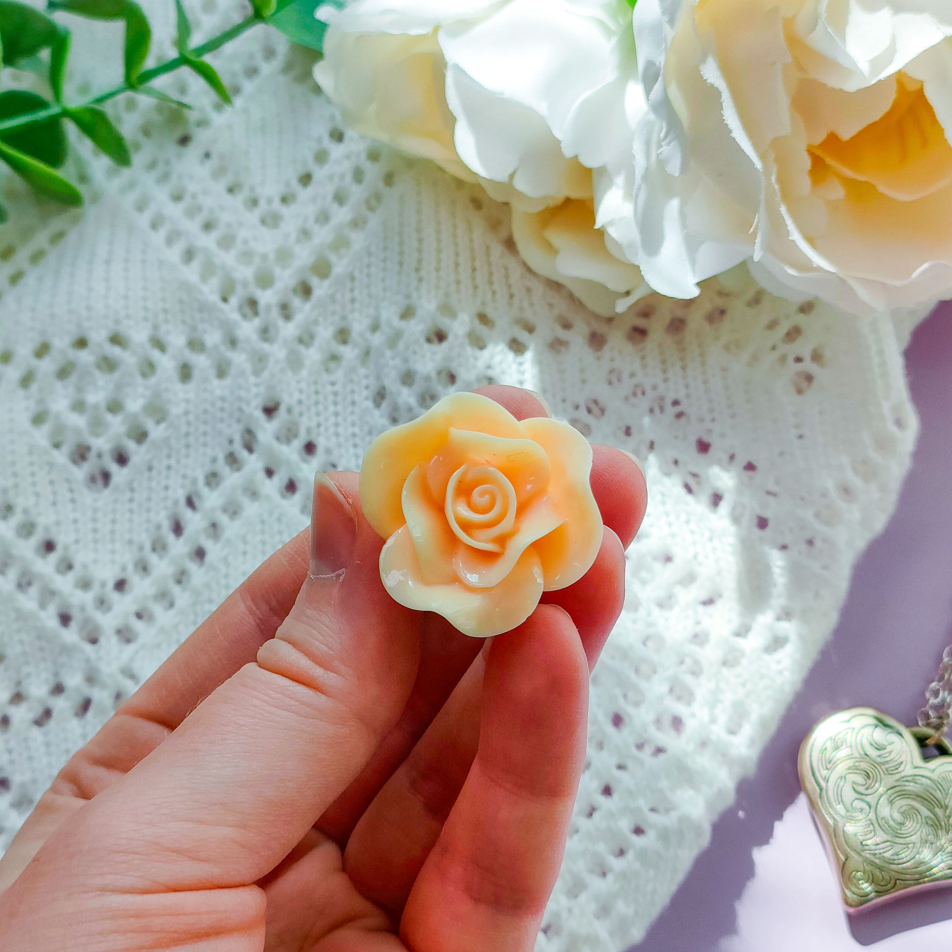 Ruusuteemainen sormus, metalliosa messingin sävyinen, ruusu vaaleanoranssin/vaaleanpunaisen sävyinen.